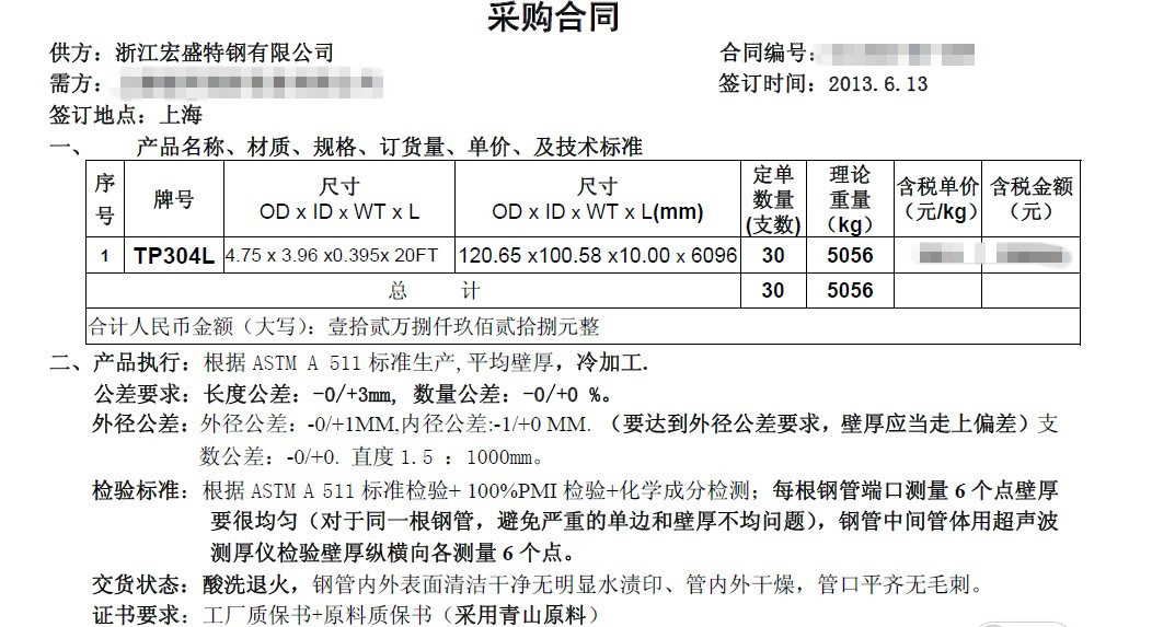 質(zhì)量保證:  質(zhì)量保證:供方提供不銹鋼管的質(zhì)保書(shū)為產(chǎn)品合格的初步驗(yàn)證。在檢驗(yàn)時(shí)效內(nèi)(時(shí)效為3個(gè)月),如有任何貨物本身質(zhì)量問(wèn)題,賣(mài)方應(yīng)承擔(dān)退貨或換貨及運(yùn)費(fèi)責(zé)任;供方也應(yīng)承擔(dān)由于質(zhì)量不合格而引起的直接損失貨款,退貨、檢驗(yàn)費(fèi)用、運(yùn)輸費(fèi)用以及延期交貨引起的相關(guān)損失(如供方供貨拖期,每天按照合同額的0.5%承擔(dān)拖期賠償金,但最高不超過(guò)合同總值的10%。如供方拖期超過(guò)30 天,需方有權(quán)解除合同,并收回所有預(yù)付貨款及拖期賠償金)